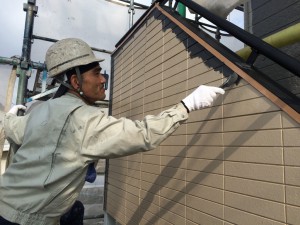 外壁の中塗り塗装工事の施工の様子になります。 (オーデフレッシュSi)