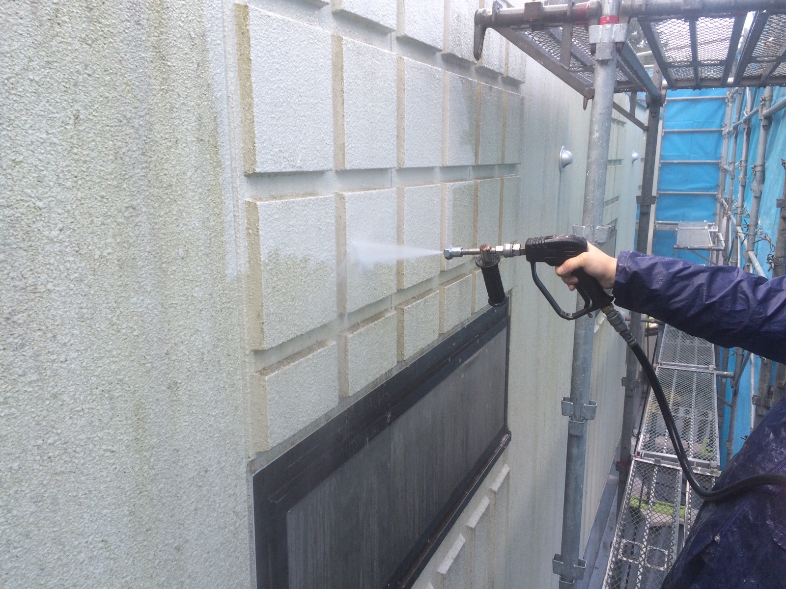 こちらは早良区のお寺の塗装工事の現場になります。昨日高圧洗浄を行っております☆